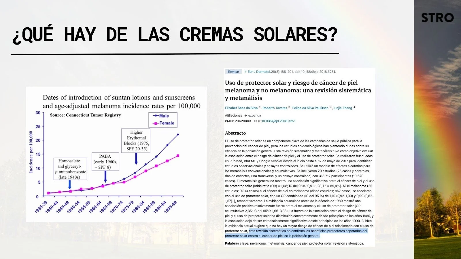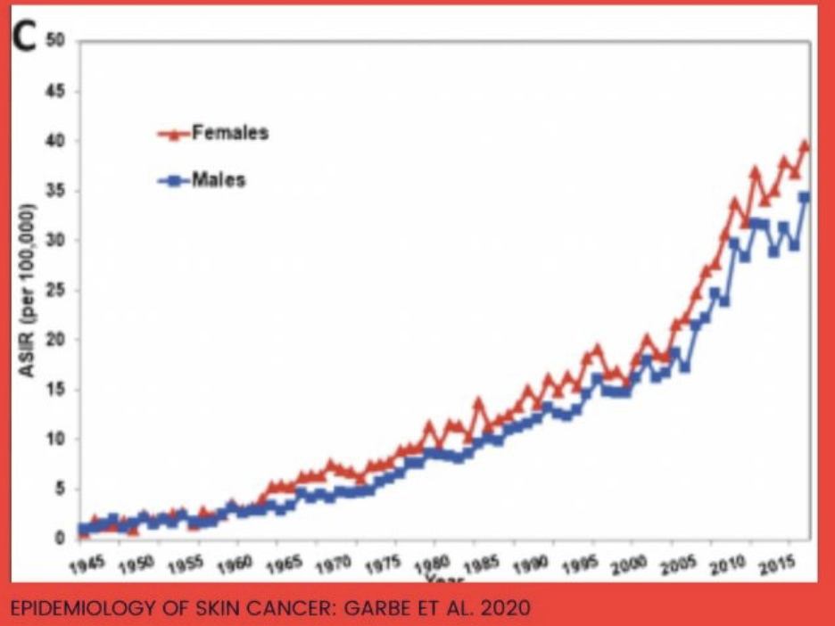 “En el período inicial (1950-1954), el diagnóstico de melanoma invasivo era RARO. Entre 1950 y 2007, las tasas generales de incidencia se multiplicaron por 17 en los hombres y por 9 en las mujeres”.